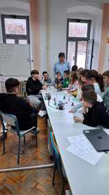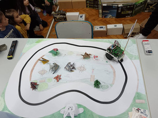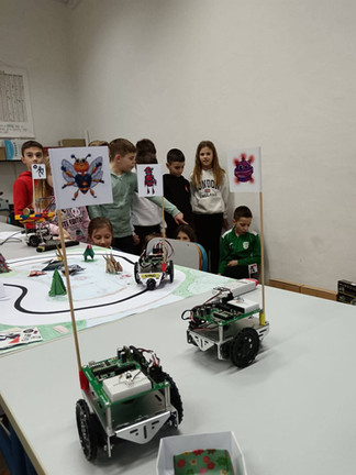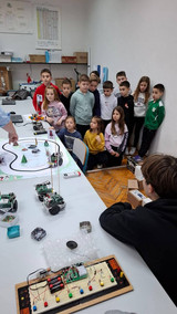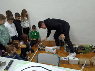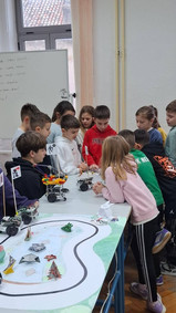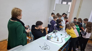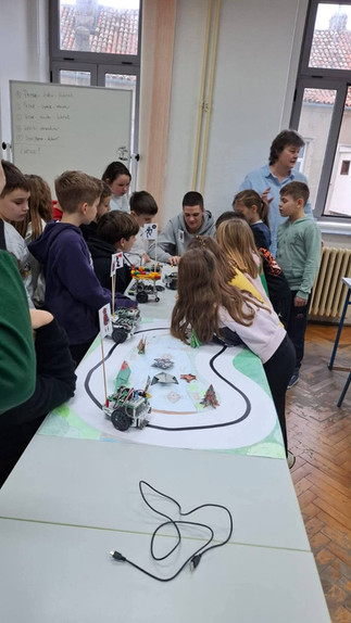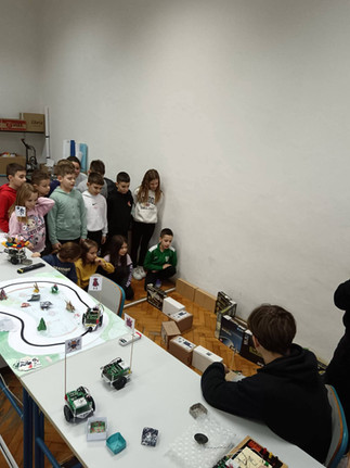 Naši mali gosti poželjeli su zaviriti i u svijet srednjoškolaca – vidjeti što to „veliki” uče. U učionici broj 5 dočekala ih je profesorica Jadranka Gostović zajedno s učenicima Dinom Selakom, Petrom Jurinom i Louisom Lennartom Šojatom. Ondje su upoznali BoeBot robotiće, ali ne samo to – uz pomoć naših srednjoškolaca i sami su njima upravljali. U njihovim očima vidjeli su se sreća, uzbuđenje i ponos, a naši su učenici strpljivo i s osmijehom pokazivali kako se upravlja robotima, dijeleći znanje i potičući znatiželju.