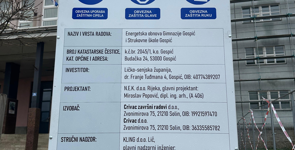 Temeljem potpisanog Ugovora o izvođenju radova u cilju energetske obnove zgrade Gimnazije Gospić i Strukovne škole Gospić, vrijednosti 2.462.884,40 eura kojeg su potpisali ličko-senjski župan Ernest Petry i direktori poduzeća CRIVAC d.o.o. Marin Jurčić i Nediljko Domazet, jučer su započeli radovi koji uključuju obnovu ovojnice odnosno fasade, zamjenu cjelokupne vanjske stolarije, ugradnju dizalica topline i fotonaponsku elektranu, zamjenu unutarnje rasvjete, izgradnju punionice za električna vozila i postavljanje koso podizne sklopive platforme s ciljem osiguranja pristupačnosti osobama s invaliditetom i smanjene pokretljivosti.